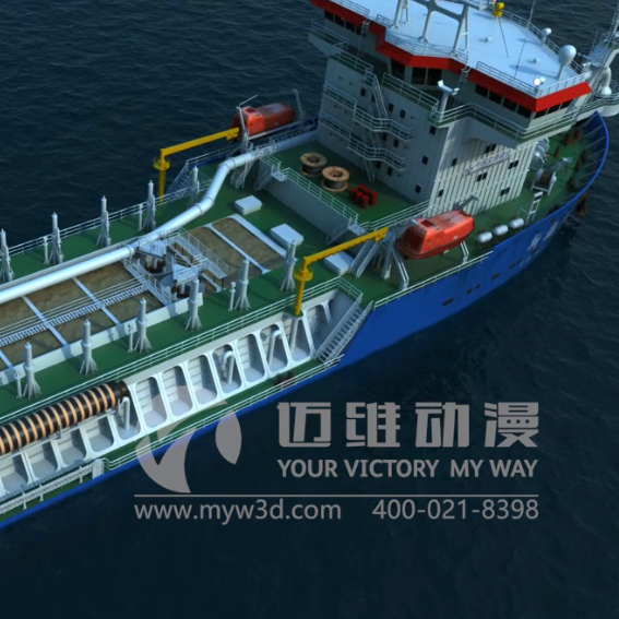 邁維動漫制作的耙吸挖泥船施工動畫,拍攝不受時空、天氣影響,高度還原現(xiàn)場環(huán)境,保證每個細(xì)節(jié)都與真實(shí)施工過程沒有差異。無論是水下耙吸過程、泥艙內(nèi)部展示還是拍泥過程,都能充分演繹。